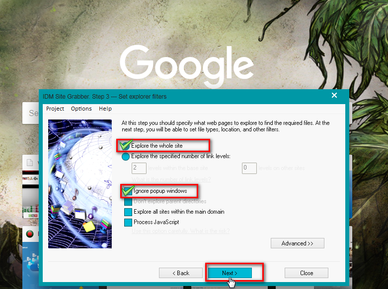 উপরের চিত্রের মত Explore The Whole Site চেক করে দিন সাথে Ignore Popup Windows এরপর Next বাটনে ক্লিক করুন।